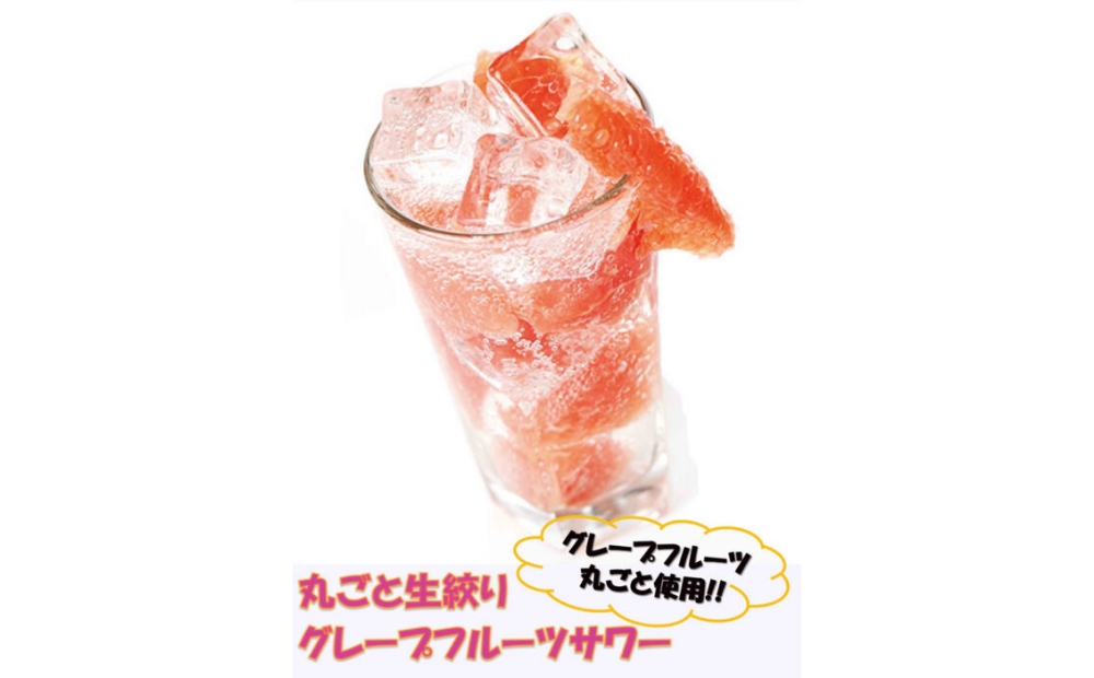 丸ごと生絞りピンクグレープフルーツサワー専門店。ピンクグレープフルーツを丸ごとその場で生絞り!超強炭酸サワーとの相性抜群です!グレープフルーツは肝臓に嬉しい成分が豊富!その中でもイノシトールは高脂肪肝ビタミンとも呼ばれており二日酔い予防にバッチリ!!