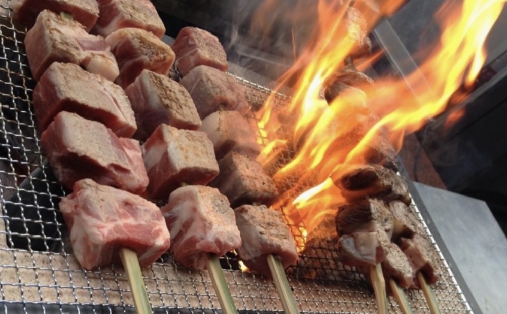 直径46センチの肉厚ジューシーなジャンボロースステーキ串秘伝のタレに漬け込み炭火で焼き上げます。 仕上げに能登のオリジナルの塩田の塩をふりかけます。金沢の味を是非ご賞味ください。